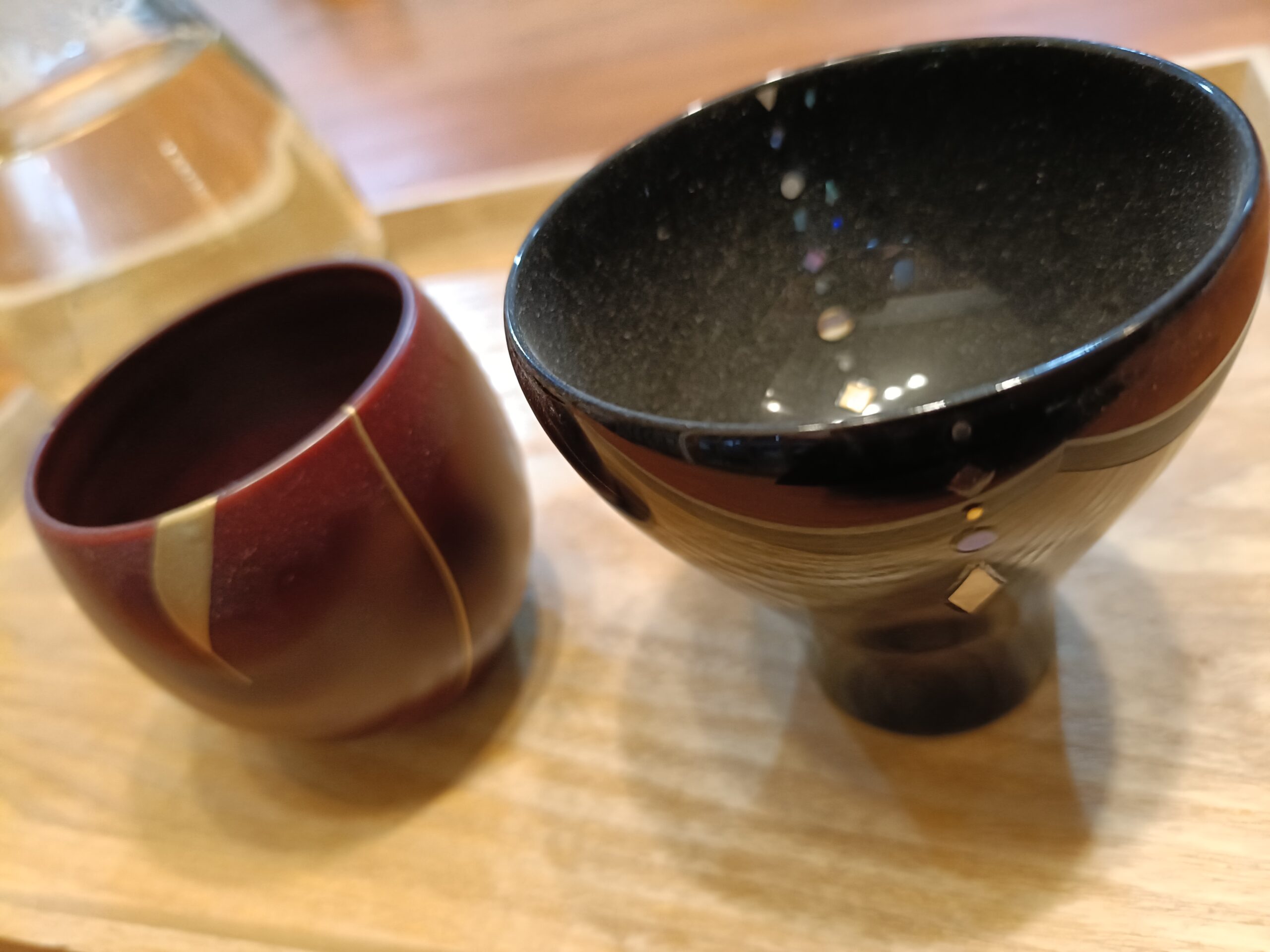 輪島塗りの酒器 海辺のカフェと宿 2025.11.03 八丁浜ことひ 輪島塗りの酒器。 能登訪問時に現地の作家さんから購入したものですが、とても深い風合いと手触りでお気に入りです。 夜BARで、地酒をご注文時におつかいいただけます🍶
